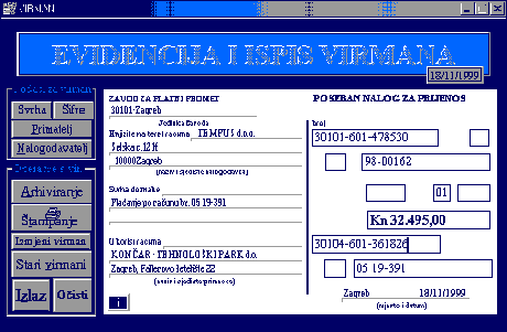 - unos, izmjena, arhiviranje i ispis pojedinačnih virmana;